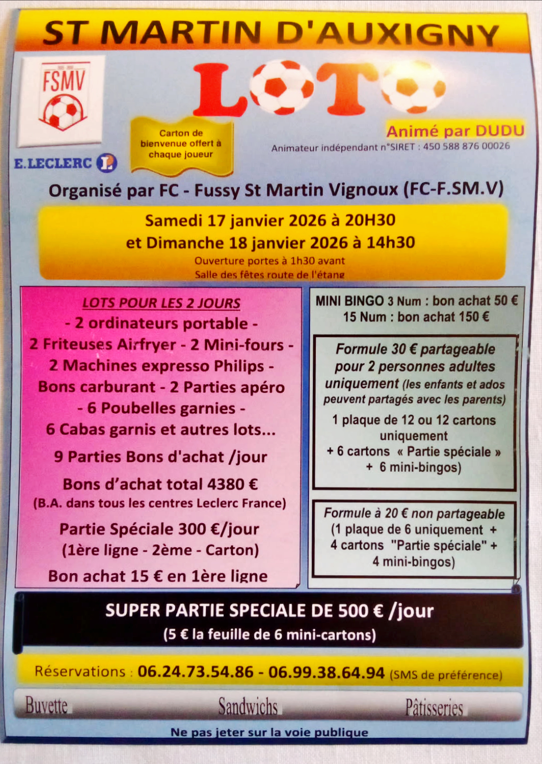 Le Football Club Fussy St Martin Vignoux organise son Loto le samedi 17 janvier 2026 à 20h30 et le dimanche 18 janvier 2026 à 14h30. Venez monbreux, de très beaux lots sont à gagner.