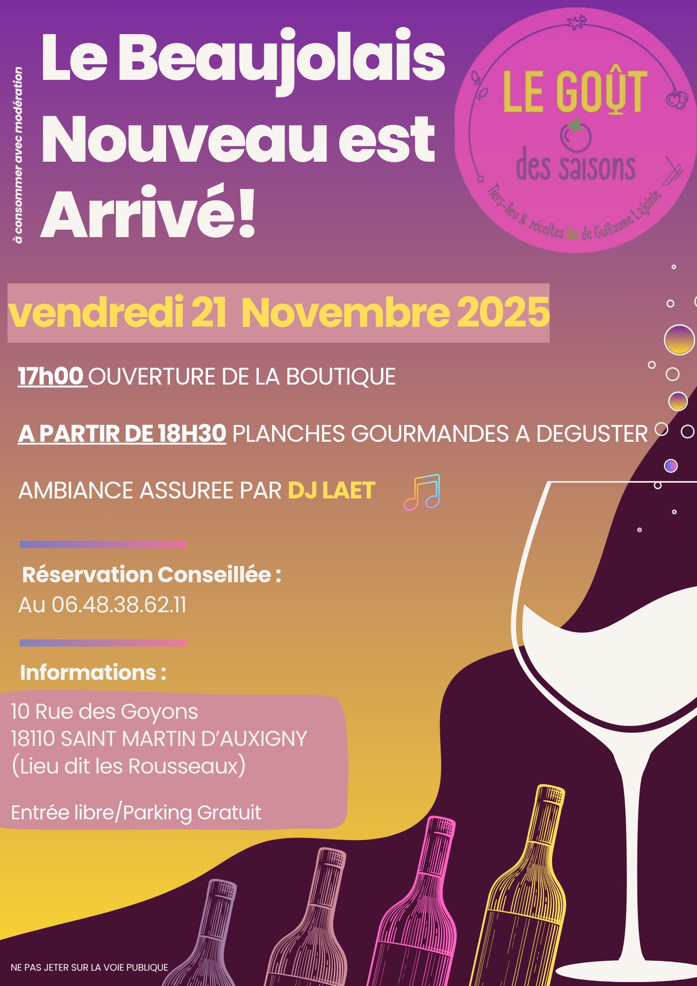 Le beaujolais nouveau est arrivé. Guillaume Lajoinie « Le Goût des saisons » vous donne rendez-vous le 21 novembre dès 17h00 pour le découvrir en boutique avant une dégustation de planches gourmandes à 18h30 dans une ambiance festive ! Réservation conseillée.