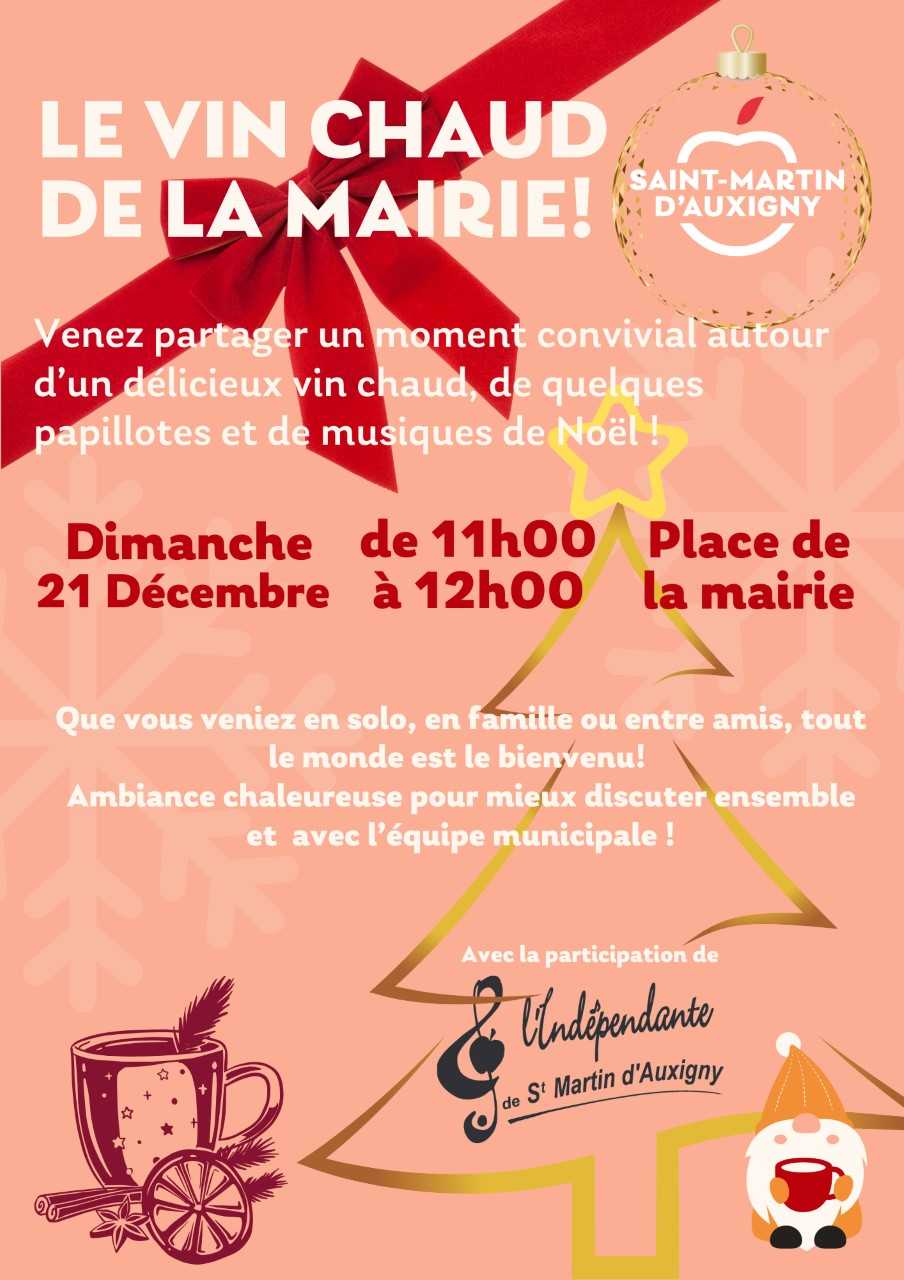 Dimanche 21 décembre à 11 heures, l’équipe municipale vous invite à partager un moment convivial autour d’un vin chaud, avec les plus belles mélodies de Noël interprétées par l’Indépendante.