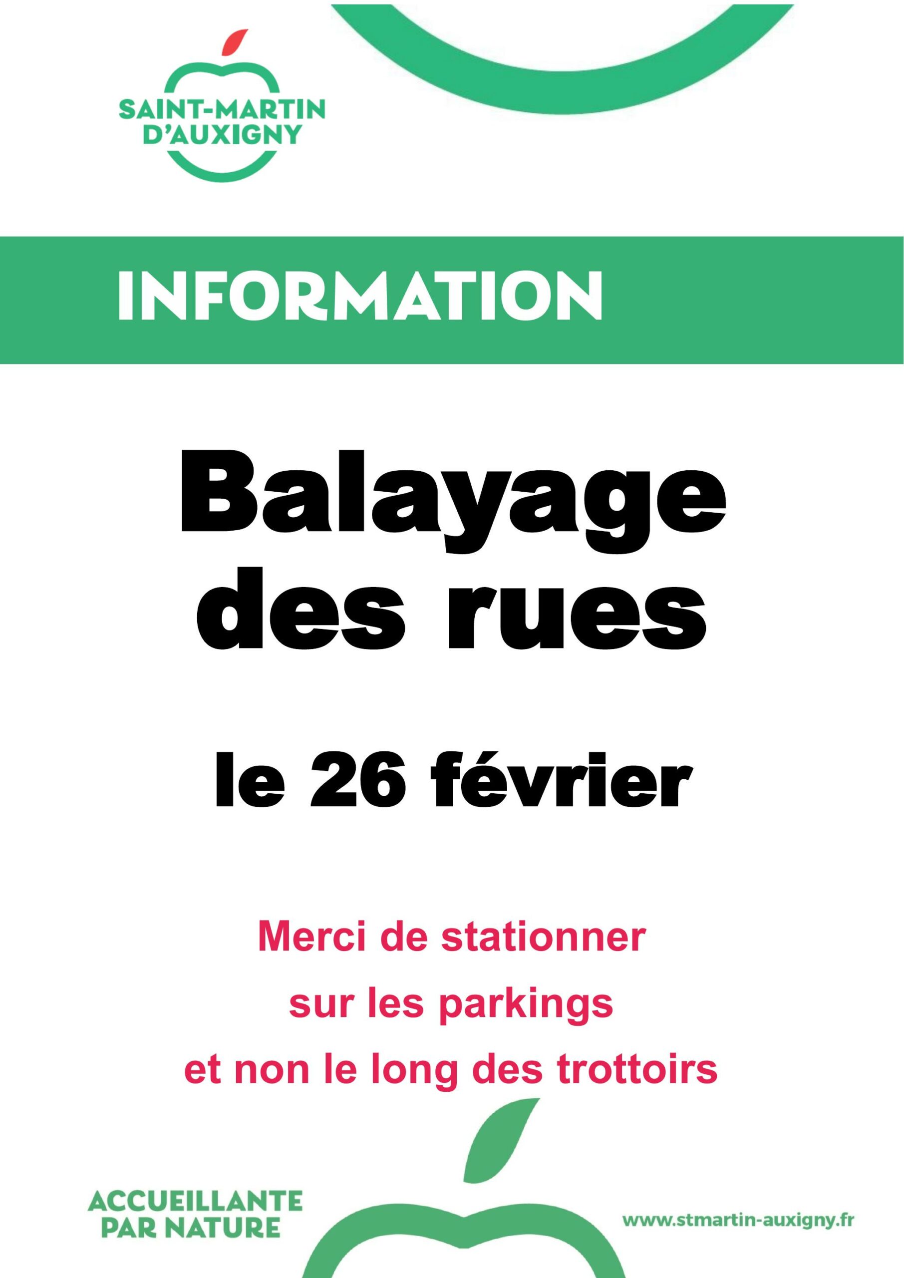 Balayage des rues le jeudi 26 février. Merci de stationner sur les parkings et non le long des trottoirs.