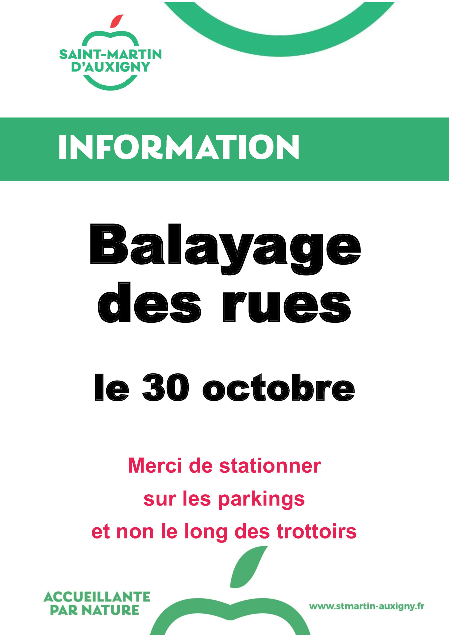 Le Balayage des rues aura lieu le 30 octobre 2025. Merci de stationner sur les parkings et non le long des trottoirs.