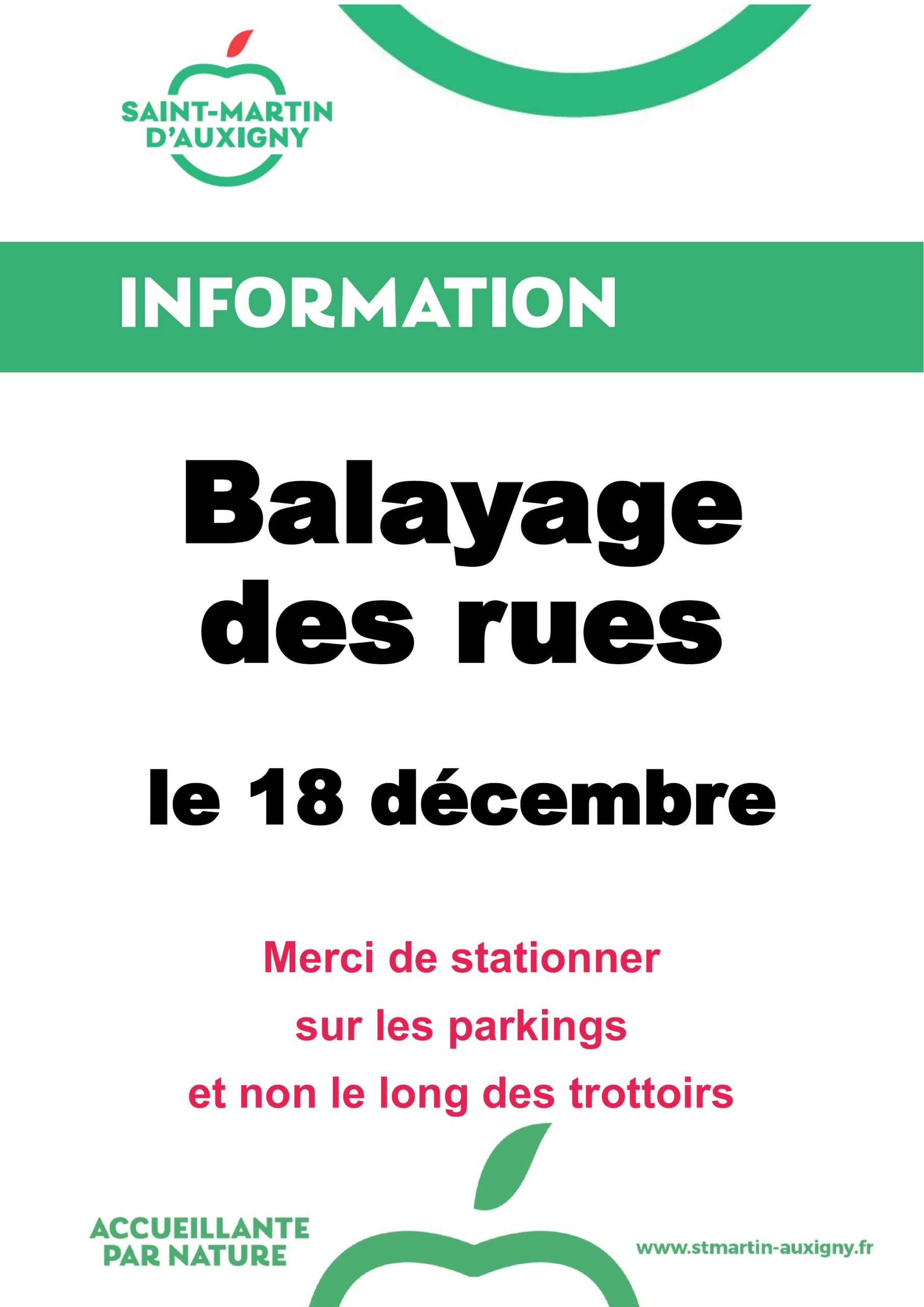 Balayage des rues le jeudi 18 décembre 2025. Merci de stationner sur les parkings et non le long des trottoirs.