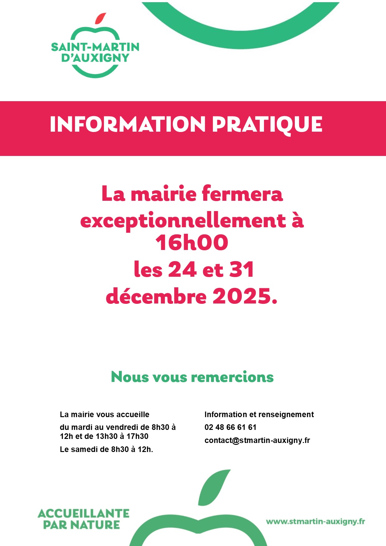 La Mairie fermera exceptionnellement à 16h00 les 24 et 31 décembre 2025.