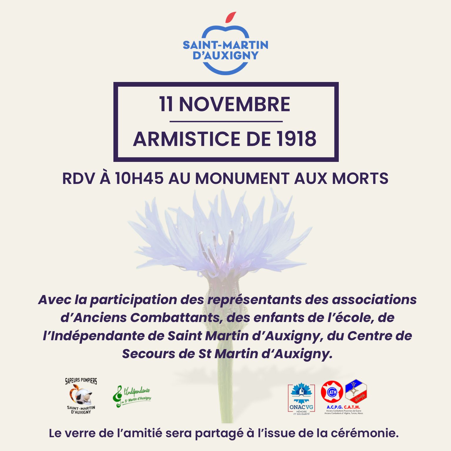 Le 11 novembre 2025 marque le 107-ème anniversaire de l’armistice qui mit fin aux combats de la Première Guerre mondiale. La Municipalité et les Anciens Combattants vous convient à la cérémonie commémorative du 11 novembre qui débutera par le rassemblement des participants place de la mairie.