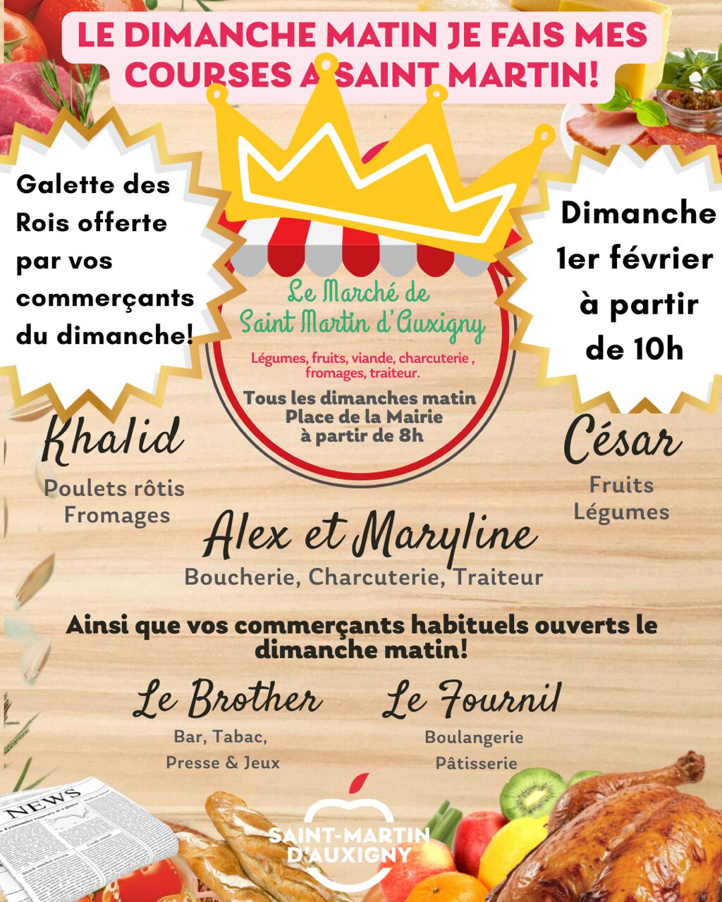Dimanche 1er février, le marché de Saint-Martin-d’Auxigny sort la couronne. Vos commerçants du dimanche vous régalent et vous offrent la Galette des Rois! Alors venez faire vos courses et peut être repartir avec la fève ! Bonne humeur garantie !