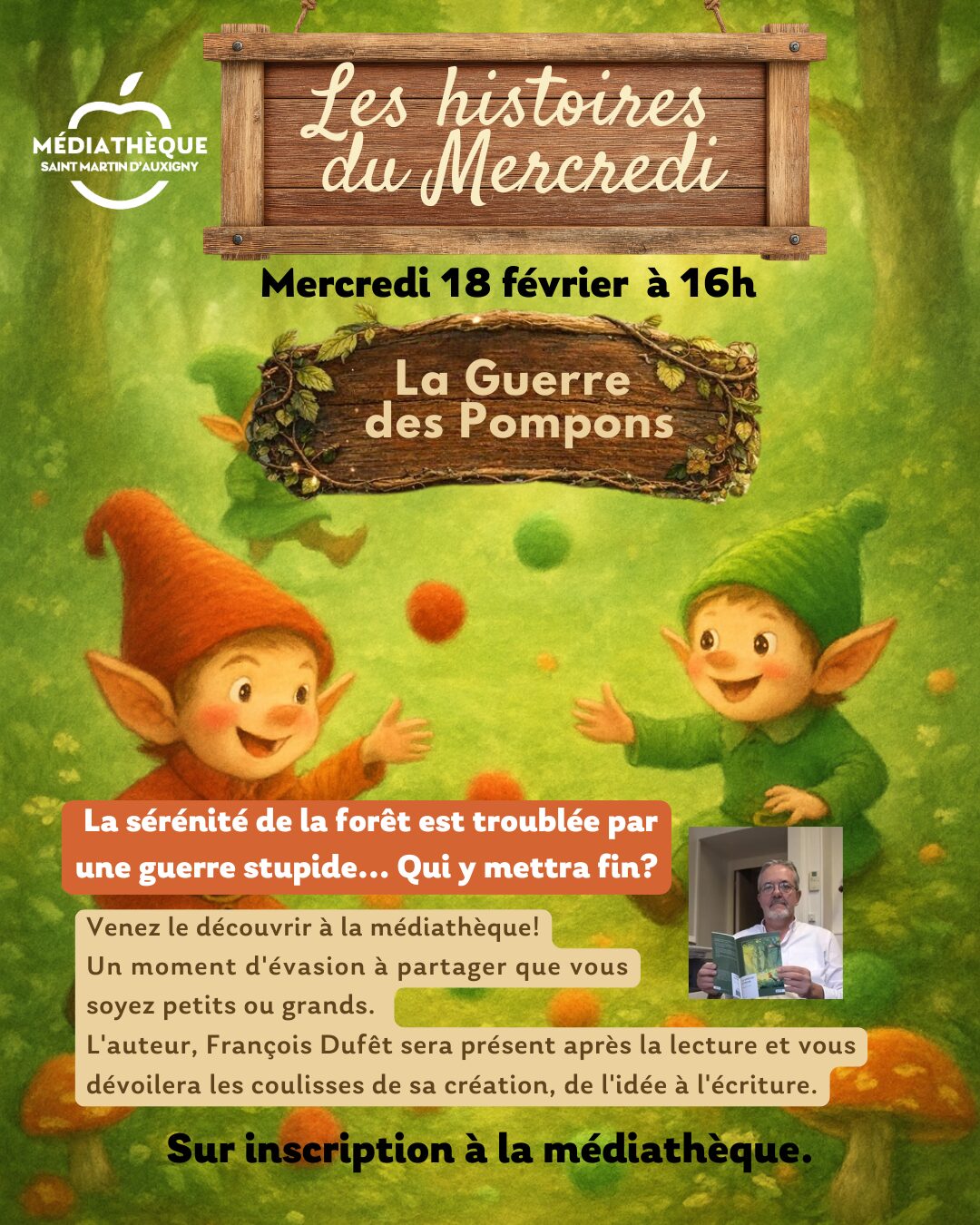 En février, les histoires du mercredi reviennent avec François Dufêt, un auteur qui n’a jamais vraiment perdu son âme d’enfant. Son amour des animaux et de la nature qui l’a vu grandir ont marqué ce premier essai « La guerre des Pompons », un roman jeunesse qui saura émerveiller petits et grands. Après une lecture découverte, un temps d’échange est organisé avec les enfants et les plus grands. Nous vous attendons nombreux !