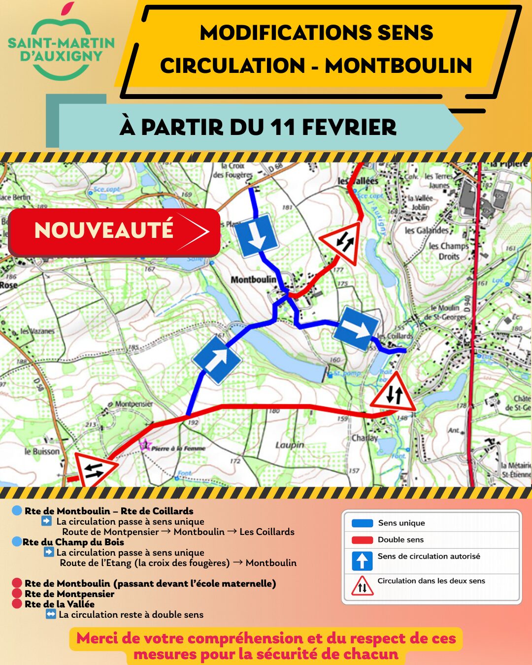 Dans le cadre des travaux actuellement en cours dans le bourg de Saint-Martin-d’Auxigny, des aménagements temporaires de circulation ont été instaurés afin de garantir la sécurité des riverains, des piétons et de l’ensemble des usagers de la route.
