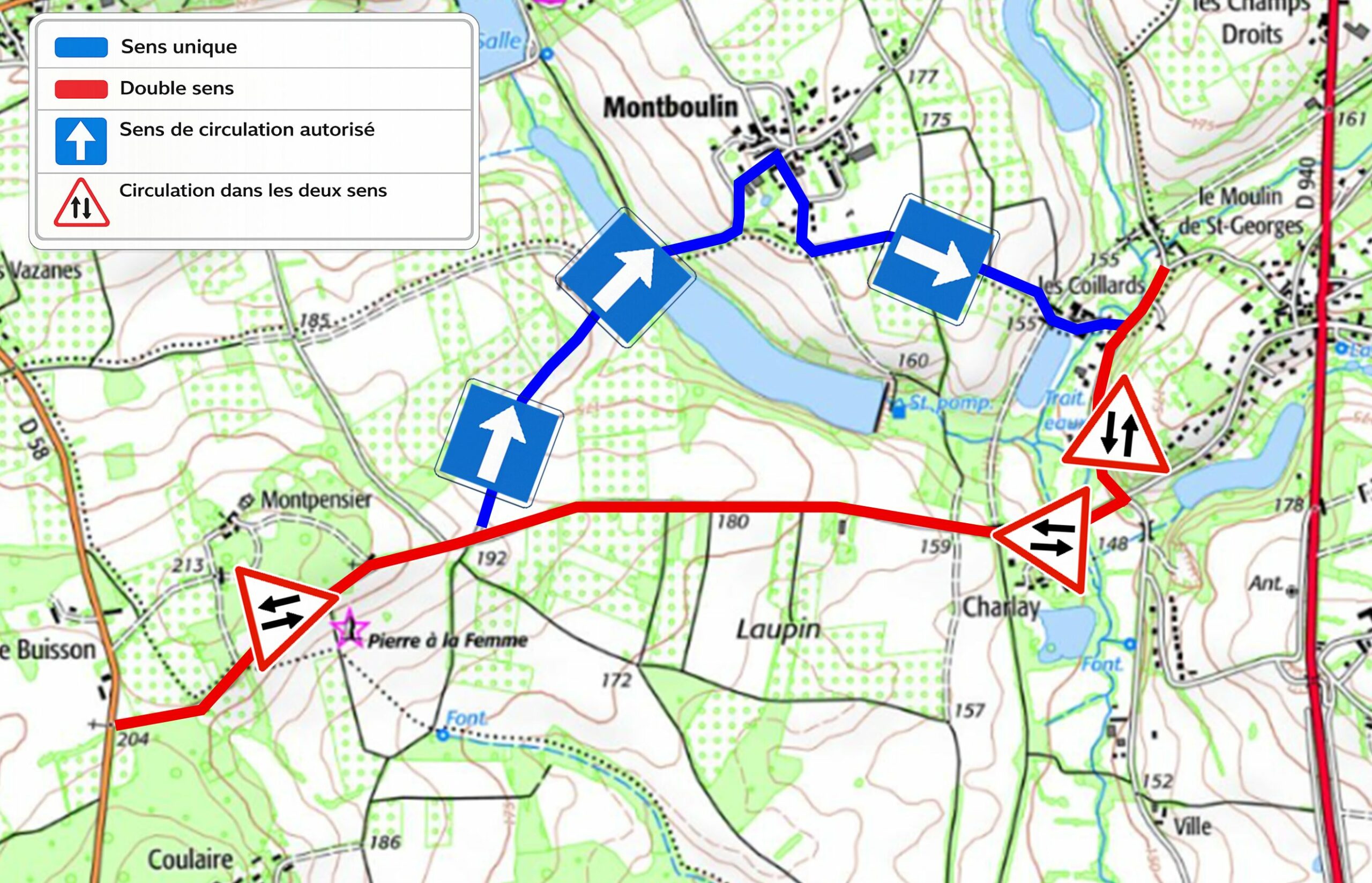 Route de Montboulin – Route de Coillards : la circulation est désormais établie en sens unique selon l’itinéraire suivant :